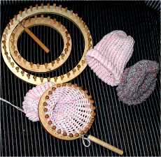 Baby hats made on the newborn loom and on the sock loom. (Sock loom makes a preemie hat to fit a 4-5 lber) |
