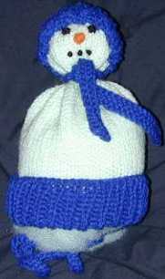 Cut a strand of white yarn and weave it through the stitches in the row above the 2nd rnd of decreasing on main hat. Stuff head & embroider eyes/nose/mouth with black for eyes/mouth and orange for nose. End off, weave in ends.