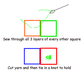 When you have every other square tied, it is time to finish the edge of your quilt. Some people either buy an edging/binding to use, others sew their own with strips of material. Another method is to simply turn the edge under and tuck inside (an inch or so all around) and stitch around through all 3 layers.